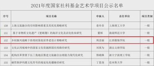 近日,全國(guó)哲學(xué)社會(huì)科學(xué)工作辦公室公示了2021年度國(guó)家社科基金藝術(shù)學(xué)項(xiàng)目立項(xiàng)名單,江西服裝學(xué)院藝術(shù)設(shè)計(jì)學(xué)院副教授周彥麗申報(bào)的國(guó)家社科基金藝術(shù)學(xué)項(xiàng)目《鄉(xiāng)村振興戰(zhàn)略下傳統(tǒng)村落旅居養(yǎng)老設(shè)計(jì)策略研究》獲立項(xiàng)公示。據(jù)介紹,這是江西服裝學(xué)院首次獲批國(guó)家社科基金藝術(shù)學(xué)項(xiàng)目,標(biāo)志著江西服裝學(xué)院在國(guó)家社科基金藝術(shù)學(xué)項(xiàng)目立項(xiàng)方面取得了重大突破。 ![]() 2021年度國(guó)家社科基金藝術(shù)學(xué)擬立項(xiàng)項(xiàng)目共221個(gè),其中重點(diǎn)項(xiàng)目17個(gè),一般項(xiàng)目151個(gè),青年項(xiàng)目29個(gè),西部項(xiàng)目24個(gè)。