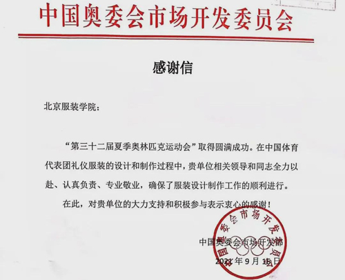 北服收到中國奧委會寄來的感謝信
