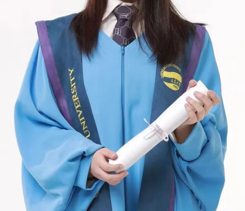 學位服右側繡有青島大學的標準英文字體,左側繡有校徽