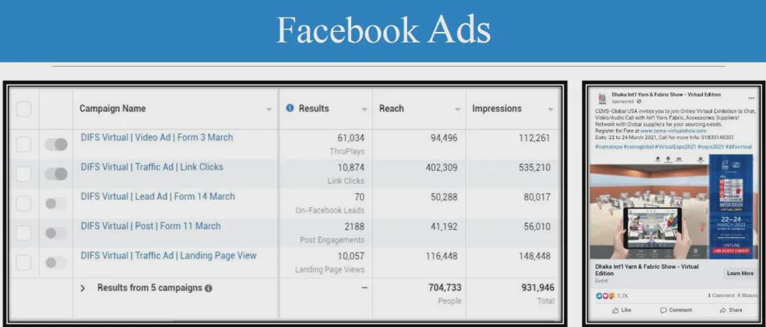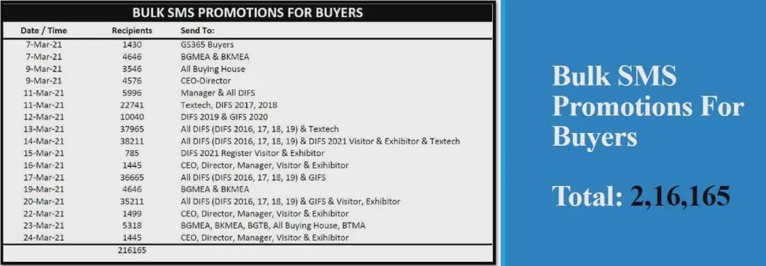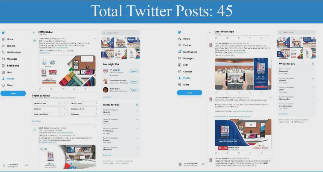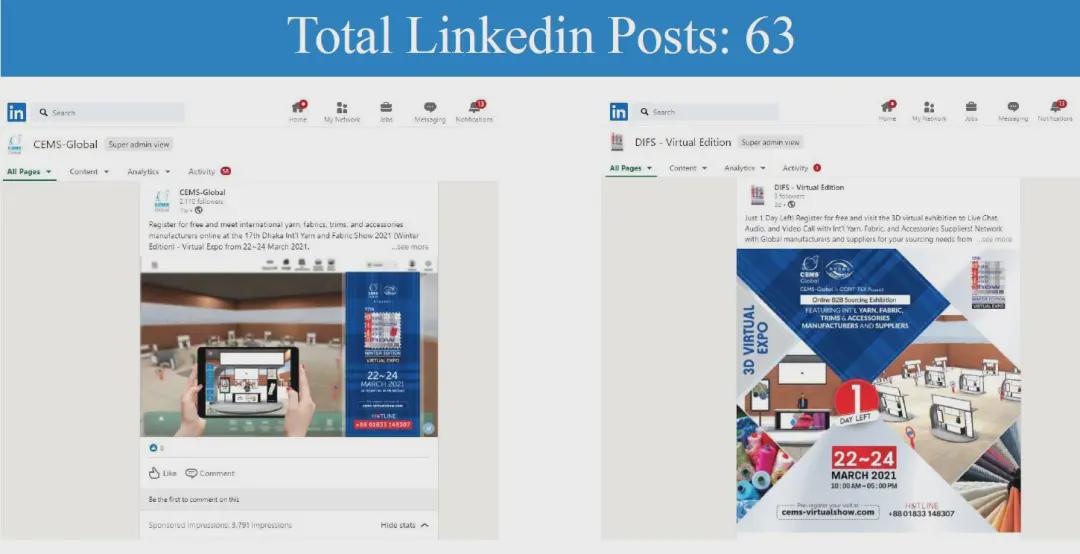 面對疫情的沖擊和挑戰,中國國際貿易促進委員會紡織行業分會與展會合作方CEMS Global積極探尋解決方案,最終決定將實體展會從ICCB展館搬到云端。展會于2021年3月22-24日舉行,三天觀眾人數達到1,208名專業采購商,來自中國和印度等亞洲國家共計53家企業參展,平均每家參展商與20家采購商建立聯系。 展會宣傳匯總PROMOTION CAMPAIGN