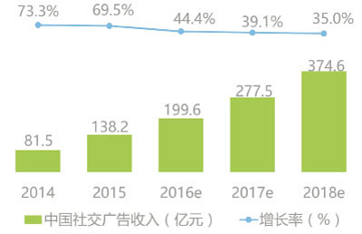 本刊記者_韓蕊/文圖整理 艾瑞咨詢/數據來源及分析 中國網絡營銷現狀及趨勢 社交廣告價值不斷凸顯 2015年,中國網絡廣告市場規模達到2093.7億元,同比增長36.0%,增速較2014年有所下降,但整體增速相較于傳統媒體廣告收入增速依然保持較快增長。當前市場整體規模已超2000億元,開始逐漸步入成熟期,預計未來增速將有所放緩。預計到2018年,網絡廣告市場規模將突破4000億元。 艾瑞最新數據顯示,2015年,移動廣告市場規模在900億元以上,預計到2018年突破3000億元。移動端廣告增速遠超網絡廣告增速,在整體互聯網廣告中的占比將持續增大,網絡廣告將繼續向移動端遷移,新投入也將進一步增長。 同時,2015年,中國社交廣告規模為138.2億元,預計到2018年將接近400億元。中國及全球的社交網絡營銷整體均呈現快速增長的趨勢,廣告價值不斷凸顯。無論是Facebook、Twitter,還是微博、QQ空間、微信朋友圈,社交廣告的發展仍具有較大空間。 2014-2018年中國社交廣告規模及預測