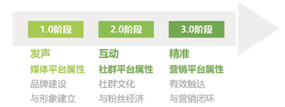 中國社交網絡營銷現狀 從媒體平臺到營銷平臺 從企業運營的角度來看,中國社交網絡營銷自發展以來主要經歷了3個階段:從社交平臺僅僅作為新的傳播渠道,到增加互動反饋、形成粉絲經濟與文化,再到通過技術手段精準投放、有效觸達。企業對社交網絡營銷的需求越來越大,社交網絡參與到品牌營銷的程度逐步加深,社交網絡營銷價值也得到了更多的體現。在此過程中,企業與品牌形象也變得越來越貼近用戶、越來越具有個性。 中國社交網絡營銷發展三階段