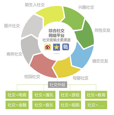 中國社交網絡營銷核心價值 解決廣告主痛點 帶入用戶情感 品牌積累與互聯網如何深度融合?廣告主在傳統領域積累的優質營銷勢能,如何在數字渠道上進一步整合發酵成為關鍵點。 用戶情感營銷如何提升品牌溫度?消費者行為受到人際關系、感覺、信念與態度等心理因素的影響,品牌需要有效融入消費者情感。 互動效果如何有效轉化形成良性循環?廣告點擊、互動效果如何更好形成轉化仍對廣告主形成困擾,從曝光到交易的營銷閉環成為剛需。 如何全面追蹤營銷效果達到品效合一?品效合一是廣告主的最根本追求,完成全面的效果統計,對營銷效果的全鏈條追蹤是行業的共同關注點。 針對以上廣告主痛點,社交網絡營銷的優勢就在于具有個性化、社交化、精準化、整合化的特點,通過“產品/品牌+用戶情感+良好體驗”,塑造個性而深刻的品牌形象。 中國社交網絡平臺分類及發展 綜合社交為營銷主要渠道 中國社交網絡主要分為綜合社交、興趣社交、同性交友、婚戀交友、母嬰社區、校園社交、圖片社交、陌生人社交、商務社交等主要類型。其中,綜合社交為目前社交網絡營銷的主要渠道。隨著移動互聯網的發展,垂直社交也有較多精準受眾,也將成為必不可少的渠道。同時,社交屬性也與多個領域交叉,產生了多種帶有社交屬性的外延應用類型。 中國社交網絡平臺分類