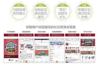 企業:社交營銷成商業閉環強入口 未來的社交營銷不僅僅是連接企業與用戶的平臺,更是企業了解用戶、與自身后臺客服和管理相連接的工具。社交平臺與企業合作的SCRM系統,將打通企業從營銷到轉化到再決策的過程,成為企業商業閉環的強入口。 首先,社交廣告能夠幫助企業收集用戶線索,可以實現數據挖掘,并從用戶的反饋和互動中獲得有價值的信息,助力產品的研發和營銷的策劃;其次,社交廣告能夠幫助企業直接實現銷售;第三,企業可以結合社交數據分析輿情、制定營銷策略、提高廣告投放精準性和銷售轉化率。 對于企業來說,社交平臺與社交網絡營銷,在產品研發、營銷、銷售、客服等很多環節連接起用戶與企業。社交平臺可以成為助力企業轉型升級的重要引擎。 圖解中國社交網絡創新營銷大事件 天貓“雙11”微博整合營銷 2015年“雙11”期間,天貓與微博深度合作,通過多種創新方式進行品牌推廣,與粉絲深入互動。整個“雙11”期間,共有3600萬人次參與搶紅包,123億官V博文閱讀,6801萬討論量,助力天貓“雙11”GMV達912億。