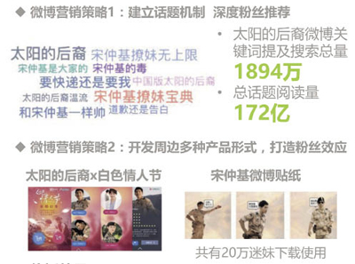 《太陽的后裔》內容營銷 2016年,熱門韓劇《太陽的后裔》在愛奇藝網站同步獨播,該劇通過微博的社交內容營銷,結合愛奇藝自身的創新營銷,取得了巨大轟動效應,成為2016年電視劇營銷的經典案例。