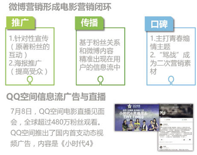 《小時代》電影營銷 由郭敬明執導、根據小說《小時代》改編的同名電影在2015年迎來收官之作。四部系列電影均以社交網絡平臺作為營銷的主戰場,從前期預熱到后期營銷,社交網絡營銷幫助《小時代》聚攏粉絲形成效應,在票房和口碑上均取得了良好效果。