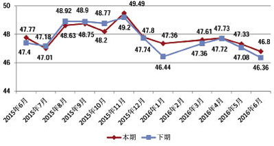 據中國·常熟男裝行業景氣度指數顯示,2016年6月,男裝行業景氣度指數繼續上月下降走勢,指數值收于46.8點,環比下降0.53個百分點,同比下降0.97個百分點。 本月市場中采購商調換貨增加,補貨較少;商戶對夏裝開始降價清倉銷售,夏休商戶較上月增加;生產方面,夏裝生產已結束,部分廠家開始秋冬裝打樣生產。銷售與生產同時放緩導致本月行業景氣指數下降。 從下期預測值來看,下期景氣指數將收于46.36點,略低于本期景氣指數0.44個百分點,企業預計下月景氣指數將繼續下行。 中國·常熟男裝景氣度指數走勢