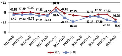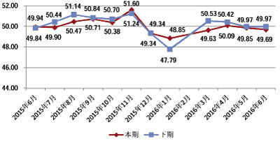 PMI指數仍處于不景氣區 2016年6月,男裝制造業采購經理人指數(PMI)仍在臨界點以下,處于不景氣區,指數值收于49.69點,環比下降0.16個百分點,同比下降0.25個百分點。 中國·常熟男裝制造業采購經理人(PMI)指數走勢