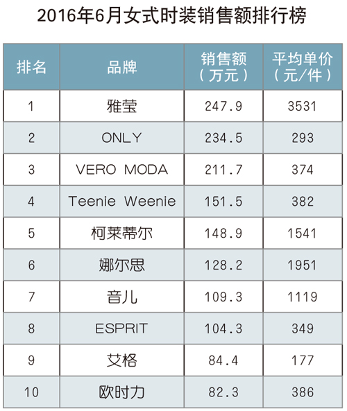 累計銷售額為22.76億元 2016年1~6月,上海十大商場服裝大類商品累計實現銷售量417.9萬件(套),同比下降9.4%;累計實現銷售額22.76億元,同比下降8.0%;平均銷售價格為544.7元/件(套),同比增長1.5%。其中,由于銷售量減少,影響銷售額減少2.62億元,由于商品結構變化及平均銷售價格變化,影響銷售額增加0.64億元,兩項合計凈減少1.98億元。 品牌業績榜 女式時裝 2016年1~6月,女式時裝累計銷售量為109.6萬件(套),同比下降19.3%;累計實現銷售額8.23億元,同比下降12.7%;平均銷售價格為750.6元/件(套),同比增長8.1%。2016年6月,銷售額前三強中,“雅瑩”品牌重返排行榜首位,銷售額環比增長4.6%;“ONLY”本年度首次躋身三強,排名第二,環比增長38.8%;“VERO MODA”獲得第三名,環比下降7.2%。