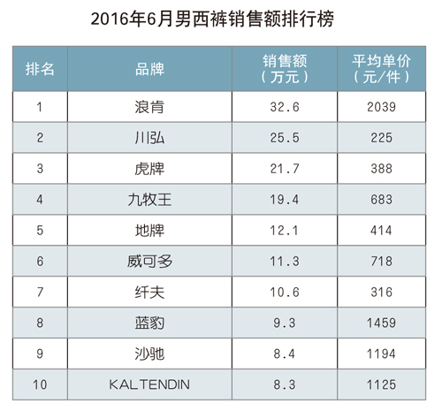男西褲 2016年1~6月,男西褲累計銷售量為4.8萬件,同比增長2.9%;累計實現銷售額2589萬元,同比增長12.4%;平均銷售價格為534.1元/件,同比增長9.3%。2016年6月,銷售額前三強中,“浪肯”品牌繼續蟬聯冠軍,環比下降42.2%;“川弘”品牌環比下降6.9%,獲得第二名;“虎牌”品牌本年度首次躋身三強,環比增長27.6%。
