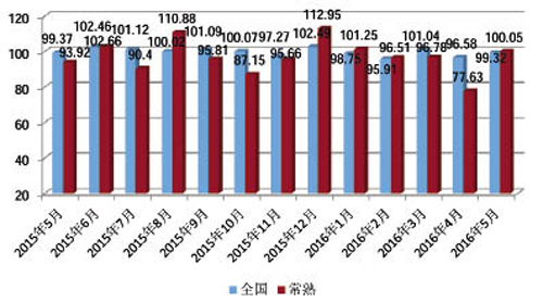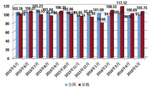 據(jù)中國·常熟男裝出口環(huán)比價格指數(shù)顯示,2016年5月,全國男裝出口環(huán)比價格指數(shù)收于103.45點,出口環(huán)比價格指數(shù)在連續(xù)4個月低于100點后,本月首次突破100點,開始回升;常熟男裝出口環(huán)比價格指數(shù)收于93.33點,出口價格延續(xù)上月下降走勢,但降幅有所縮小。 男裝出口環(huán)比價格指數(shù)