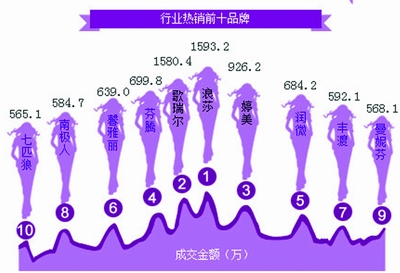 據(jù)中國電子商務(wù)研究中心統(tǒng)計(jì),2013年女性內(nèi)衣在線成交筆數(shù)1840.51萬筆,其中成交金額4.91億元,成交件數(shù)2645.64萬件。包括天貓、京東等網(wǎng)購平臺,以及品牌各自官方商城。其中前十名品牌銷售額如下圖所示。