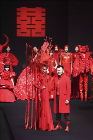 看點三 SheguangHu·胡社光:是你想要的“囍”紅嗎? 胡社光這個名字,近些年越來越自帶光芒,時尚圈內外似乎無人不曉,路人甲也能拿那套“花棉襖”侃侃時尚,無論你喜不喜歡“花布棉襖”,或者需不需要“病號服”,不得不承認,胡社光很“紅”。 無論是江河山川之紅、喜宴慶典之紅、京劇國粹之紅、生命靈性之紅都匯聚成這一系列的主題色調,附加在了這一系列作品的主題:中國人最喜歡的“囍”字上。