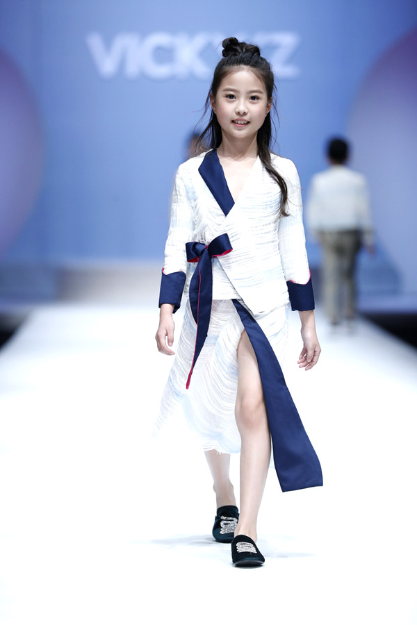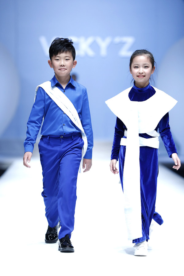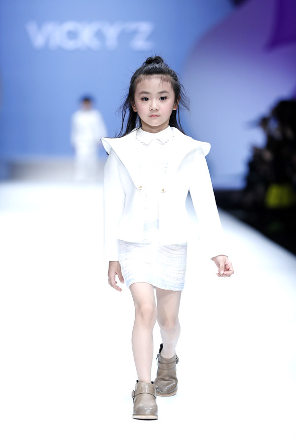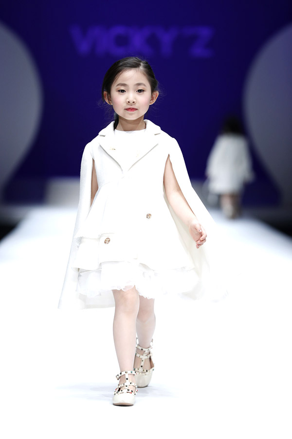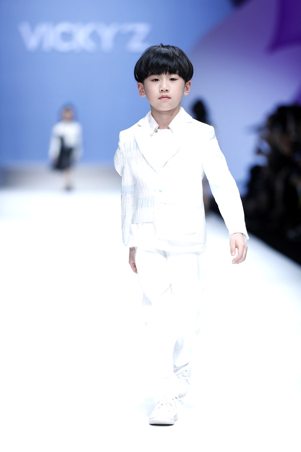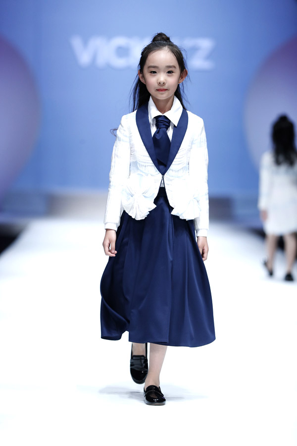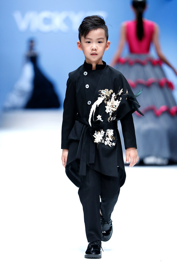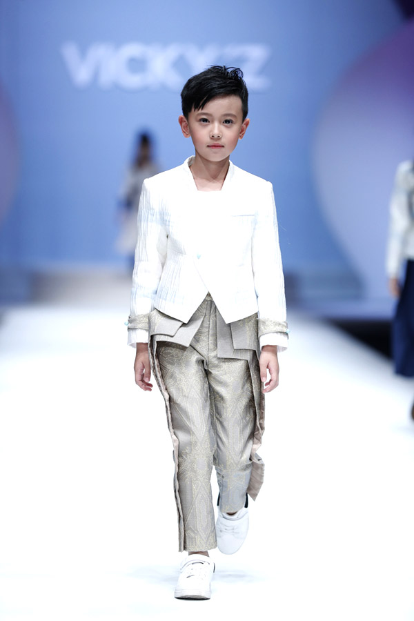 許馨尹表示:天使“隱形的翅膀”,應該是插在時尚的夢想中。VICKY’Z試用了自創的輕透、柔和的面料,點綴具有“親情紐帶”寓意的五彩線,結合時尚的形式表現孩子的純潔天真。在工藝細節方面運用立體抓褶、刺繡蕾絲、提花、印花、珠繡等工藝,增加設計時尚感,突顯許馨尹最擅長的高端禮服設計。而配飾上則多以手工制作為主,諸如玉石紐扣、景泰藍珠飾、手工立體蝴蝶等,以挑剔的制作態度呈現VICKY'Z 新一季作品。