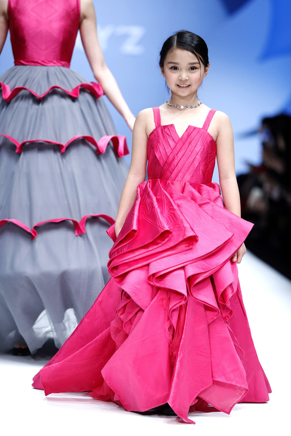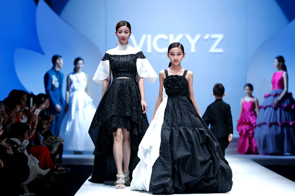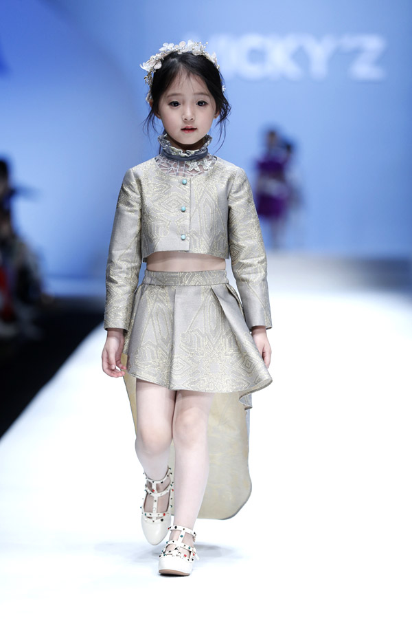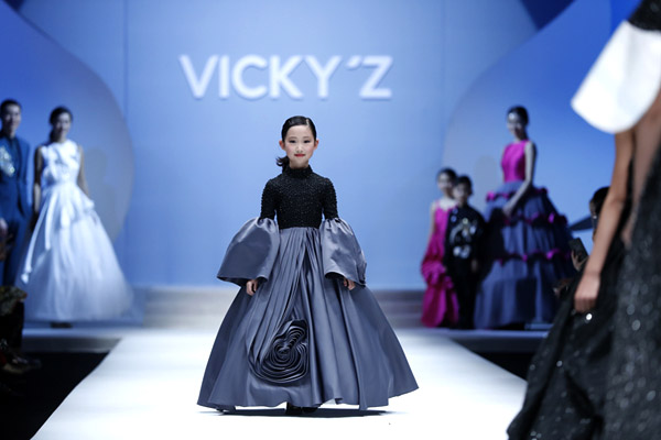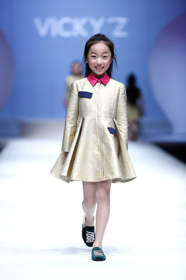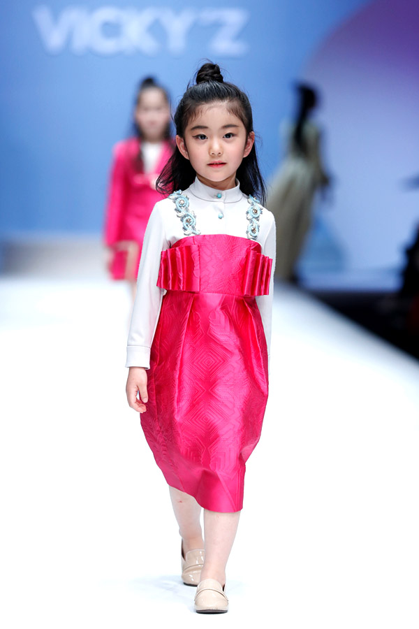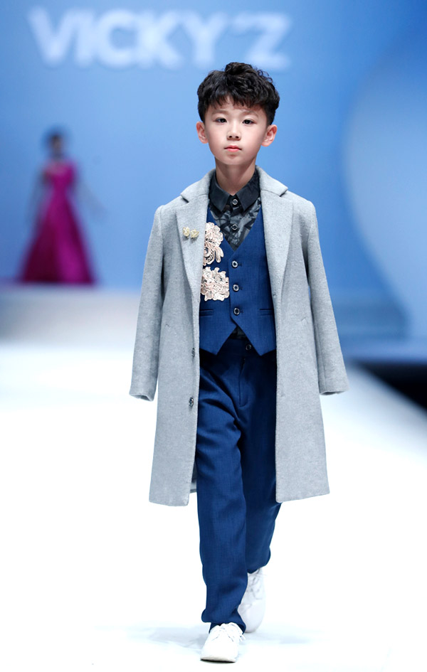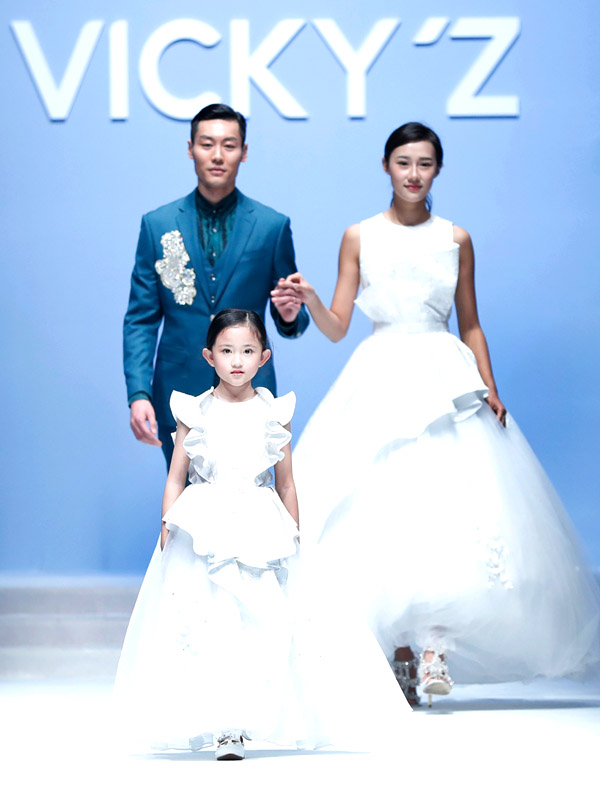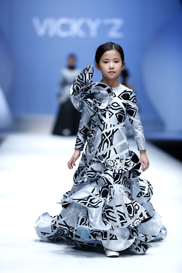 許馨尹表示:天使“隱形的翅膀”,應該是插在時尚的夢想中。VICKY’Z試用了自創的輕透、柔和的面料,點綴具有“親情紐帶”寓意的五彩線,結合時尚的形式表現孩子的純潔天真。在工藝細節方面運用立體抓褶、刺繡蕾絲、提花、印花、珠繡等工藝,增加設計時尚感,突顯許馨尹最擅長的高端禮服設計。而配飾上則多以手工制作為主,諸如玉石紐扣、景泰藍珠飾、手工立體蝴蝶等,以挑剔的制作態度呈現VICKY'Z 新一季作品。