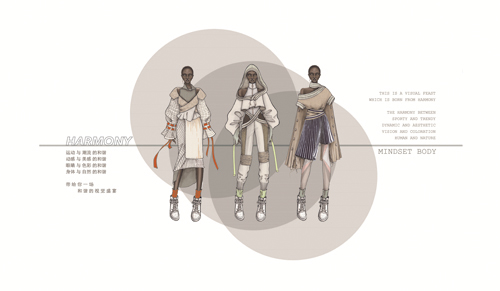 設計靈感: 在這個設計中,設計師專注于廓形與色彩的結合,以回歸自然的舒適感來作為作品的主要表達方向。 為了表達出簡潔運動風的感覺,衣身大部分采用了EASY CARE和CASHFEEL的紗線來獲取一個布面整潔,紋路清晰的效果。再結合針織服裝特有的垂墜性和蓬松感,實現(xiàn)了舒適度與時尚度良好結合的運動裝。 使用EMPIRE與拉架織成的緊身褲兼顧活動所需彈性的同時也提高了親膚透氣的舒適感。