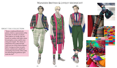 設計靈感: 靈感來源于傳統(tǒng)的印度地毯和其著名的節(jié)日-Holi,,跨越英國和印度這兩個不同的領域,呈現(xiàn)青年的俏皮和不甘平凡的特色,代表成長,心靈,自由,希望和溫暖,但靈魂中仍然擁有紳士穩(wěn)重堅定的精神。這一系列服裝選擇一種傳統(tǒng)的英國風格圖案—格子呢,代表了蘇格蘭一個家族的個性,這些圖案通常是正式和平靜,并結合印度豐富多彩的元素,使格子有趣和充滿活力的。 這作品用的是新澳CASHFEEL 2/48Nm紗線,配合機種stoll cms 530。外套上的五色提花如果用別的紗種會很厚很硬,但CASHFEEL仍然能保持柔軟和易塑型的特性。上衣的鑲花是底紋結構,CASHFEEL紗線在洗水后會變松變軟,能好好地遮蓋原來露底的背面,令整體效果更整潔。