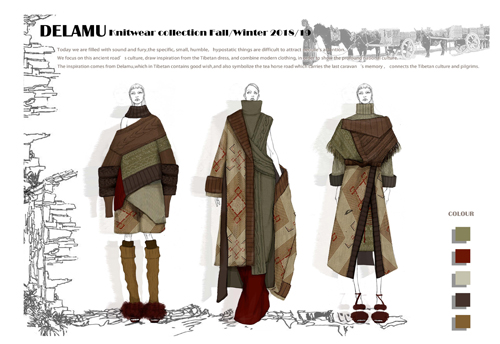 設計靈感: Wander British——德拉姆DELAMU,“德拉姆”,在藏語里寓意著美好、平安的祝愿,也象征著那條承載著最后的馬幫記憶,聯(lián)結著藏族文化,朝圣者們的朝覲之路的茶馬古道。喧鬧與躁動的今天,那些具體,渺小,卑微,密實的事物以及散發(fā)著文明氣息的人文古跡難以進入人們的視線,我們著眼于古道文化,從藏族服飾中提取靈感,結合現(xiàn)代服裝,以此展現(xiàn)深遠的民族文化。