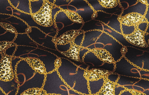 獲獎企業:浙江嘉欣絲綢股份有限公司 面料名稱:封層鎖鏈 成分:蘭精環生纖品牌纖維50%,桑蠶絲50% 看點:蘭精環保粘膠與桑蠶絲經緯交織緞紋組織,手感柔軟滑爽,光澤淡雅柔和,黑色背景下的棕色鏈條勾勒迷你豹紋圖案,印花圖樣清晰,過渡自然,在原始古樸的自然色調中演繹優雅精致的現代感。 |