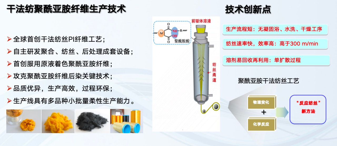 聚酰亞胺纖維主要的制備方法有兩大類:一類是濕法紡絲,而我們公司采用的是我們自己原創的干法紡絲聚酰亞胺生產技術。干法紡的生產效率,尤其是卷繞速度非常快,應該說在全球進行了一個大的突破。