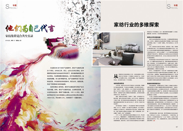 從觀望到成為電商發(fā)展的主力軍,從家紡拓展到大家居,家紡行業(yè)不單單是一個傳統(tǒng)意義上的紡織產業(yè),它始終以市場需求為導向,加快結構調整,在各個領域探索合作機會,成為紡織行業(yè)的一個閃光領域。家紡集群還提出了“大家居”的概念,尋求與家具企業(yè)、設計師的跨界合作,在智能制造方面也頗有亮點。