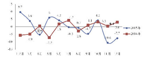 數(shù)據(jù)來(lái)源:中華全國(guó)商業(yè)信息中心 一線樣本:上海過(guò)渡平穩(wěn),進(jìn)入深度調(diào)整期 2016年,一線城市服裝零售進(jìn)入調(diào)整期。以上海為例,上海服裝行業(yè)協(xié)會(huì)網(wǎng)絡(luò)定期統(tǒng)計(jì)報(bào)表顯示,2016年十大商場(chǎng)實(shí)現(xiàn)服裝大類商品銷售收入達(dá)39.1億元,同比下降13.5%,總體累計(jì)銷售735.9萬(wàn)件,同比下降11.4%,平均銷售價(jià)格為531.0元/件(套),同比下降2.4%。 2015年12月-2016年12月上海服裝銷售走勢(shì)