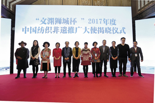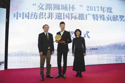頒獎(jiǎng)儀式 11月28日晚,“文淵獅城杯”2017年度中國(guó)紡織非遺推廣大使、中國(guó)紡織非遺國(guó)際推廣特殊貢獻(xiàn)獎(jiǎng)、中國(guó)紡織非遺大會(huì)會(huì)標(biāo)設(shè)計(jì)“天工獎(jiǎng)”等獎(jiǎng)項(xiàng)逐一揭曉。